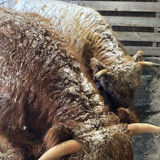 Highland cows are well-insulated by their lanolin-coated hair, which keeps them warm even when covered in snow. The snow will eventually slide off their backs.